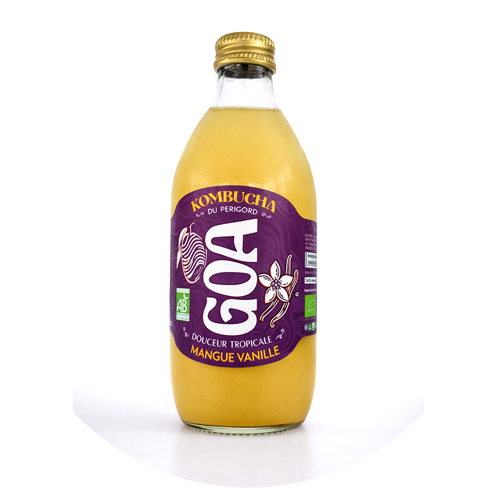 Eau filtre, culture de kombucha, thé vert Sencha, sucre de canne blond, purée de mangue, extrait de vanille bourbon de Madagascar