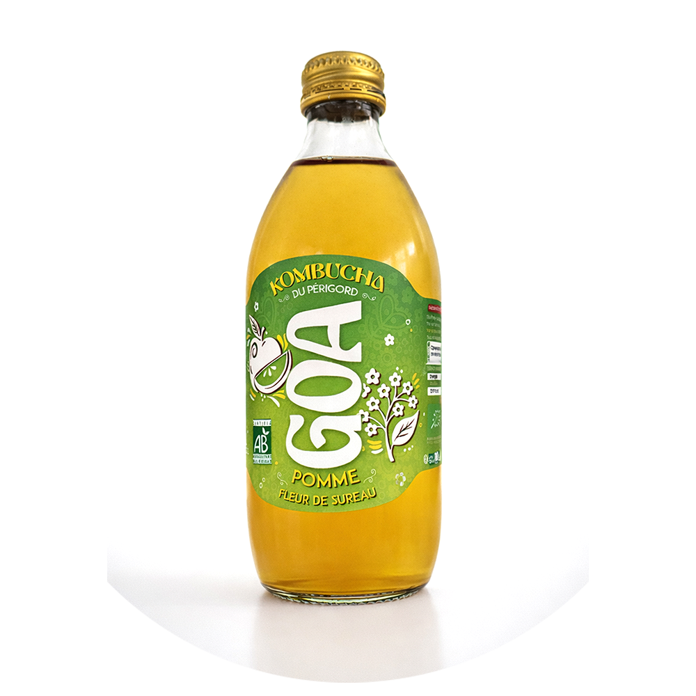 Eau filtrée, culture de kombucha, thé vert Sencha, thé noir Darjeeling orange pekoe, sucre de canne blond, jus de pomme du Lot non pasteurisé, hydrolat de fleur de sureau
